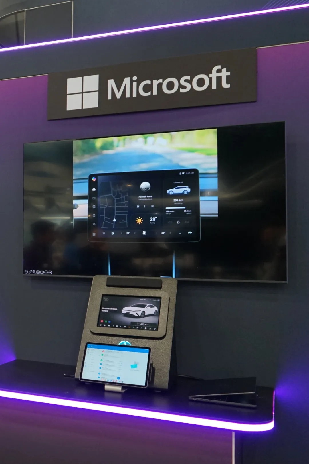 在另一台实车演示中,还展示了混合模型(Hybrid xUI),结合了CaLLM Edge SLM与云端CaLLM功能,云端和端侧的同步数据,做到上下文记忆,在断网情况下本地可以持续通话。同时集成MobileWork(安全连接Microsoft 365,提高工作效率)以及餐饮礼宾智能体(在实时交通与停车情境下查找、预订并管理餐厅预订),为用户带来便捷高效的驾驶体验。