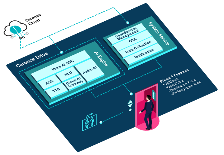 - Cerence智能建筑移动平台——为电梯和智能建筑提供人工智能语音交互,尤其符合消费者在新冠疫情期间对无接触式交互不断增加的需求。基于平台与本地操作系统可以快速无缝集成的设计,乘客无需按键便可以与电梯进行交互。过来Cerence语音识别技术,乘客可以简单的对电梯说要到的楼层,甚至只需要说出到访大楼里的公司或个人名字。Cerence智能建筑移动平台提供了全球语言覆盖,能够同时进行多语言对话,并为楼层查询服务和其他电梯的资讯内容提供云连接。