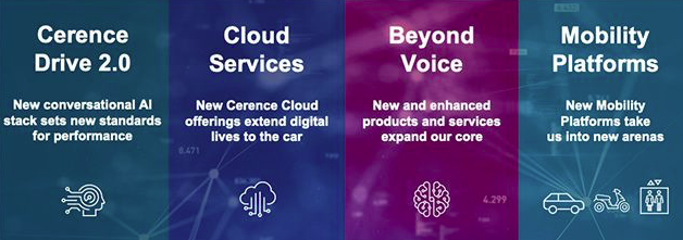 在2021年1月19日举行的Cerence首个线上发布会上,Cerence推出了多项行业领先的技术和全新功能,致力将驾驶者的全数字生活从车外延伸到车里。新一代的产品组合包括:核心技术重大升级的对话式人工智能平台Cerence Drive 2.0;可以与智能手机、智能家居和物联网集成的全新Cerence云服务(Cloud Services);以及为驾驶者与两轮车和智能建筑提供多模态交互的全新Cerence 移动平台(Mobility Platforms)。