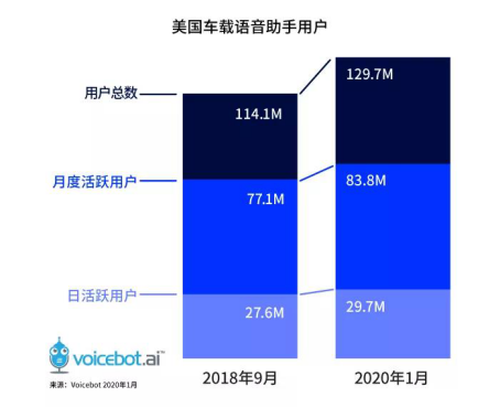 车载语音助手显然是一个巨大的市场,它的用户基础也在不断增长。截至2020年1月,美国使用车载语音助手的用户数量为1.297亿,相较于2018年9月增长了13.7%,即在此期间,用户以每月约100万的数量增长。