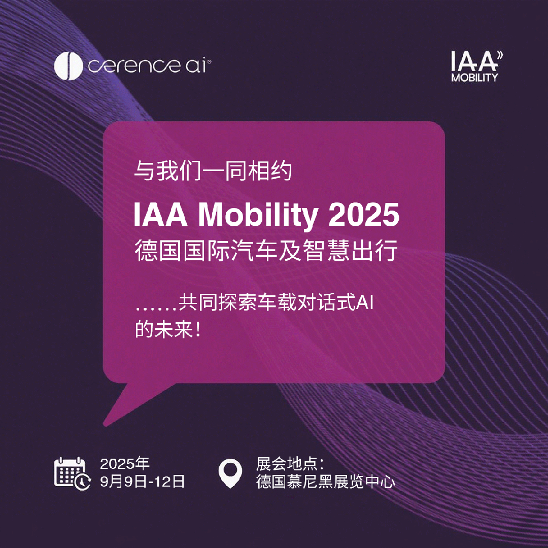 准备好以前所未有的创新方式与您的汽车对话了吗?请预留您的日期,与我们在2025年德国国际汽车及智慧出行博览会(IAA MOBILITY)不见不散!从智能体化、多模态混合语音AI,到迄今为止最直观的车载体验,我们已迫不及待,即将为您揭开未来出行全新篇章!