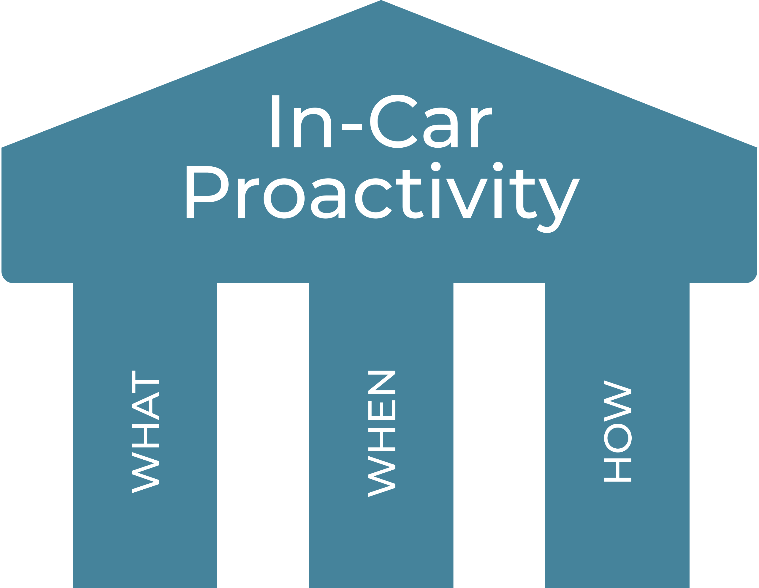 当采取主动的时候,选择什么模式?如何结合内容和时机才能产生合乎逻辑的结果?一个切实可行的框架需要将不同的模式组合归类。有些信息在驾驶者的认知中是直接相关和紧迫的,可以通过语音提示,而其他信息则可能更适合使用单一音频信号,或者由驾驶者以非主动的方式请求。不同特性的驾驶者(不同驾驶经验)需要分组,并配对不同的视觉、听觉、非语言和语言的主动概念,甚至是一个组合。对于任何与主动性相关的信息娱乐内容,系统都需要进行同样的练习,谨慎地建立一种方法来理解每个驾驶者的心理模型。关键是驾驶者在特定时间点,什么内容是相关的,以及怎样的通知方式可以避免带来太大干扰。在此,通过人工智能获取用户模型,了解哪些信息应该以何种方式呈现,同时在车辆功能性和驾驶者隐私,以及在过多(因此令人讨厌的)或过少的主动通知之间取得平衡,始终确保驾驶安全。